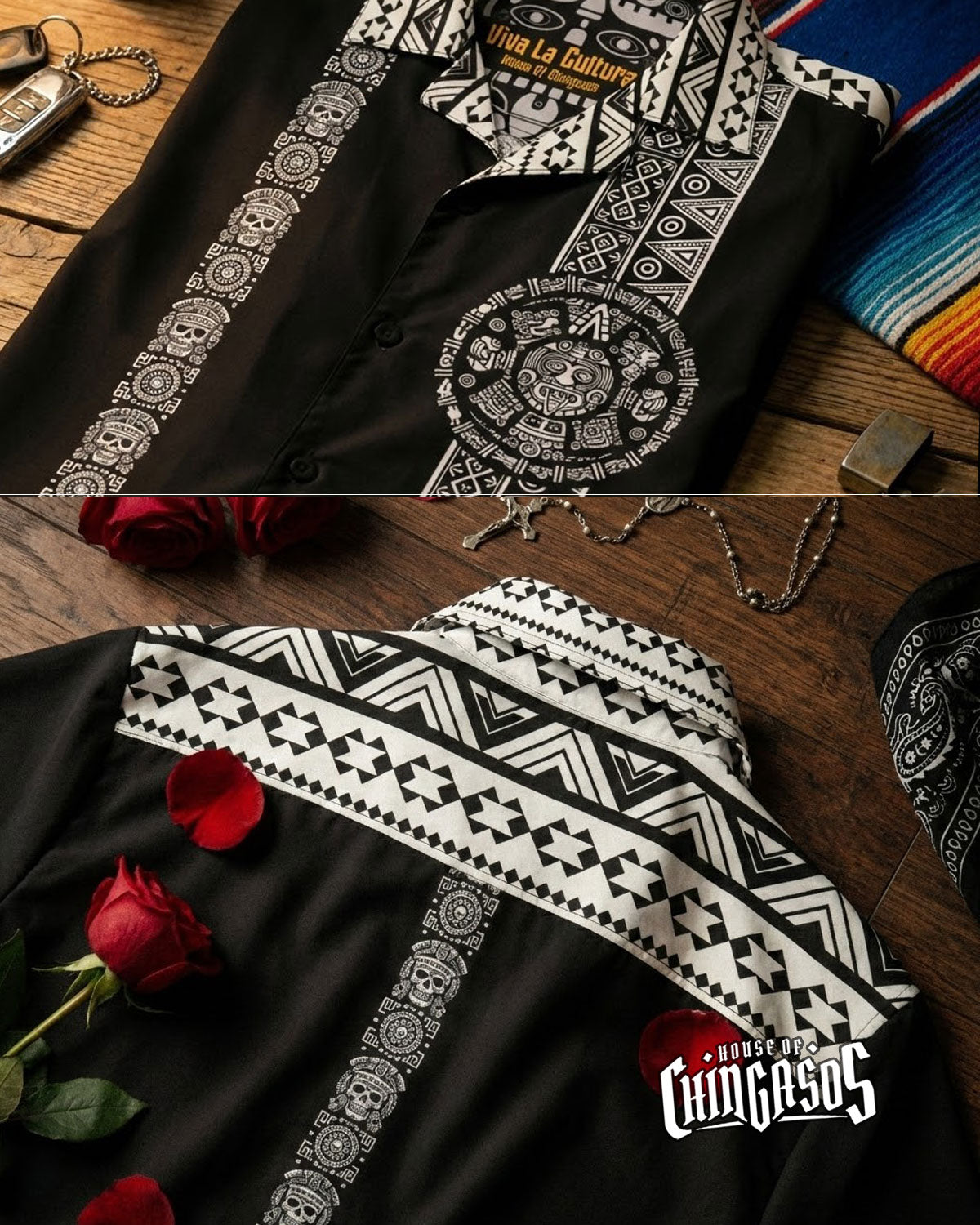 Pura Cultura. Firme in this black and white and cream Azteca Guayabera beautiful and represents everywhere we go, familia cookout the bar or anywhere Raza. Damn we look good in this one. Printed to perefction. (arrives in about 8–13 business days)